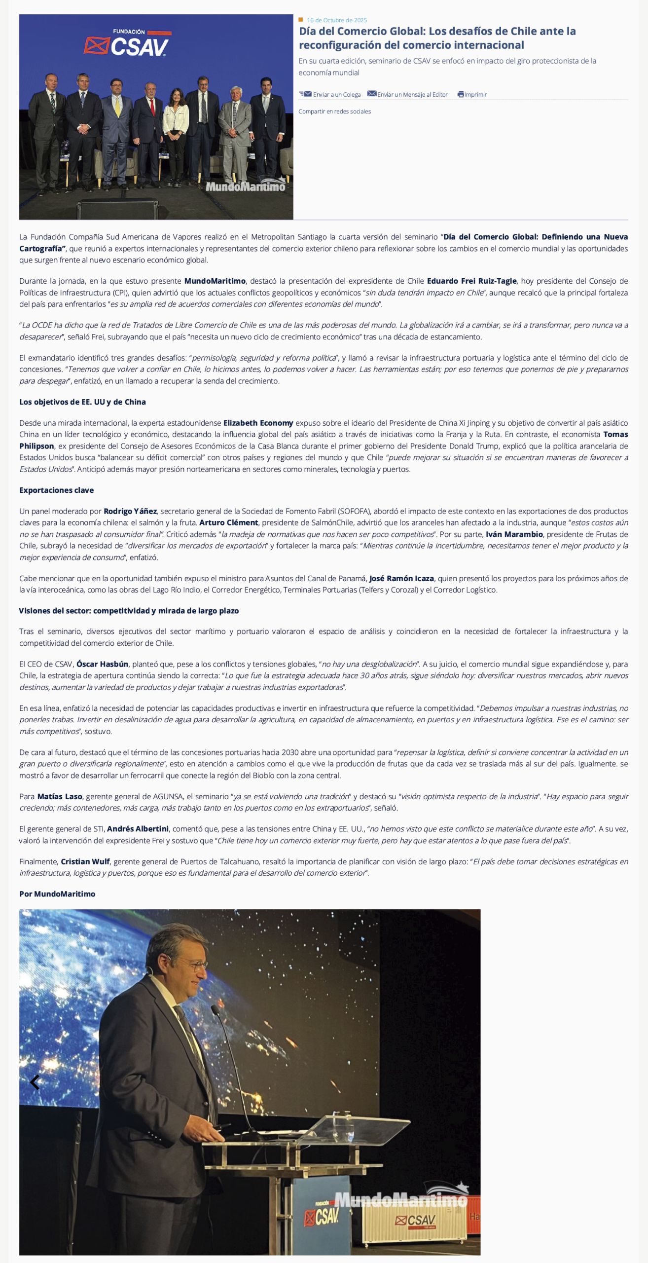 octubre 16, 2025 Día del Comercio Global: Los desafíos de Chile ante la reconfiguración del comercio internacional | Mundomaritimo.cl En su cuarta edición, seminario de CSAV se enfocó en impacto del giro proteccionista de la economía mundial