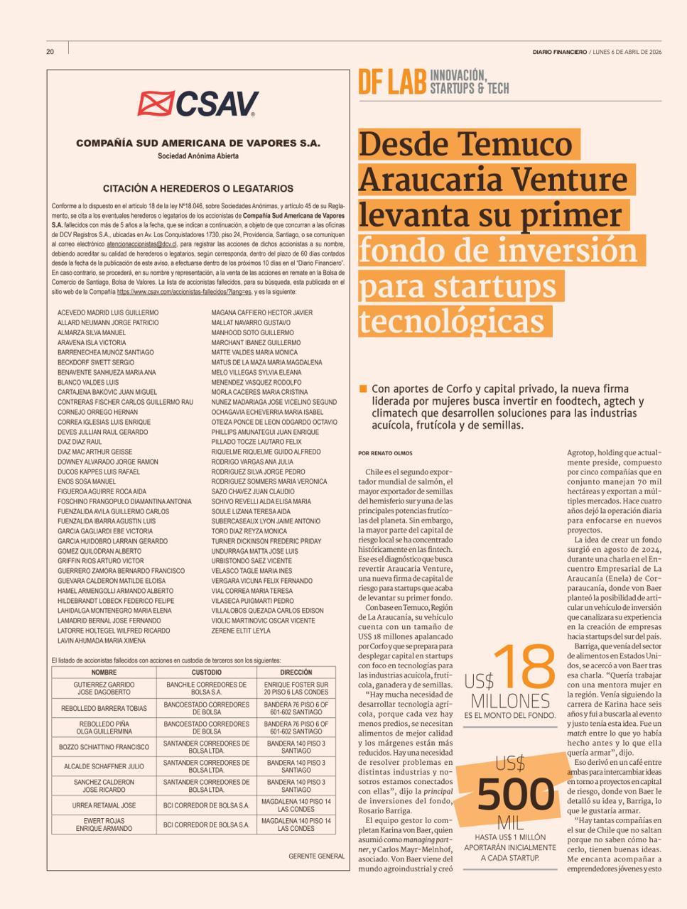 20262024202604-06-2026 | Aviso Citación a herederos o legatarios – Diario Oficial03-27-2026 | Aviso Diario Oficial202408-16-2024 | Publicación Citación a Herederos o Legatarios08-09-2024 | Publicación Citación a Herederos Diario Oficial07-29-2024 | Aviso Tipo Remate Accionistas Fallecidos