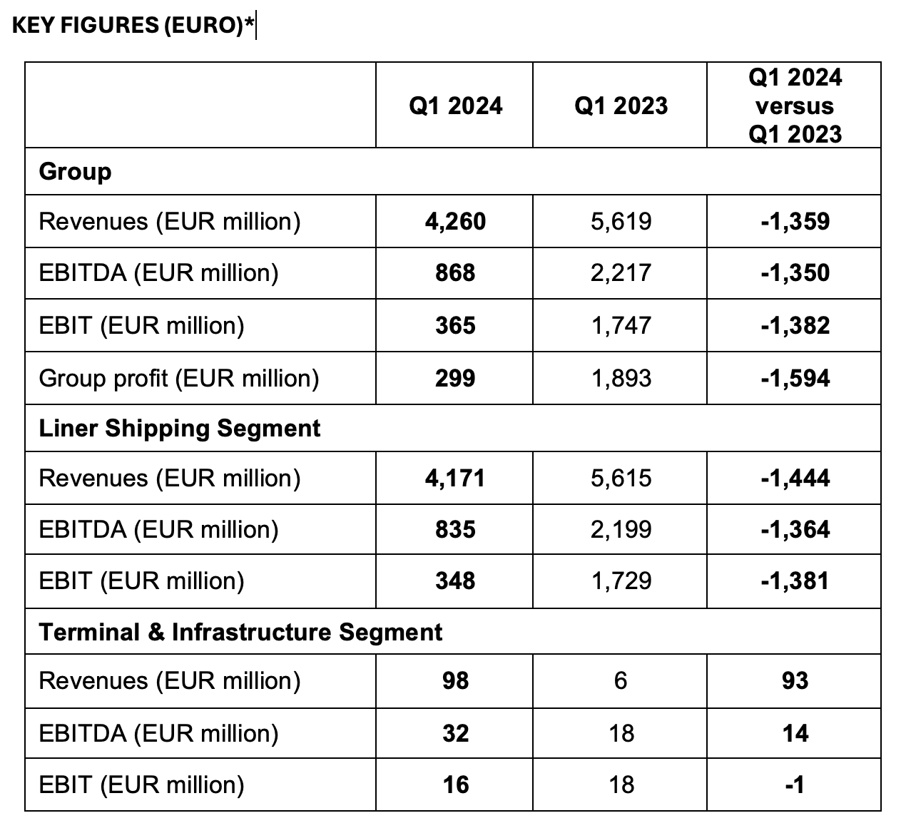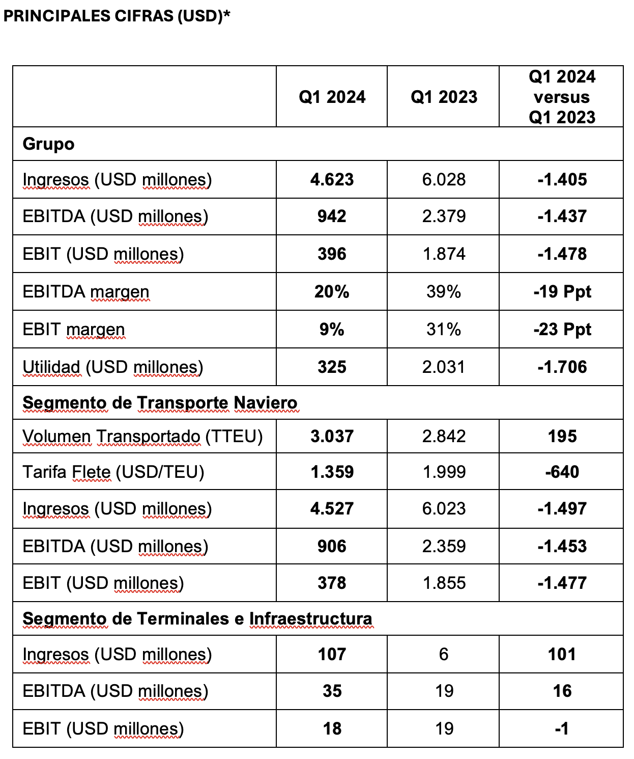 *En casos individuales, pueden ocurrir diferencias de redondeo en las tablas por razones computacionales. Con la adquisición de SAAM Ports S.A. y SAAM Logistics S.A. (conjuntamente referidos como «SAAM Terminals») el primero de agosto de 2023, las participaciones accionarias asociadas fueron incorporadas al Grupo Hapag-Lloyd y, consecuentemente, al segmento de Terminales e Infraestructura. Como resultado, las cifras en los resultados del segmento de Terminales e Infraestructura para el primer trimestre solo pueden compararse en un grado limitado con las cifras del año anterior.