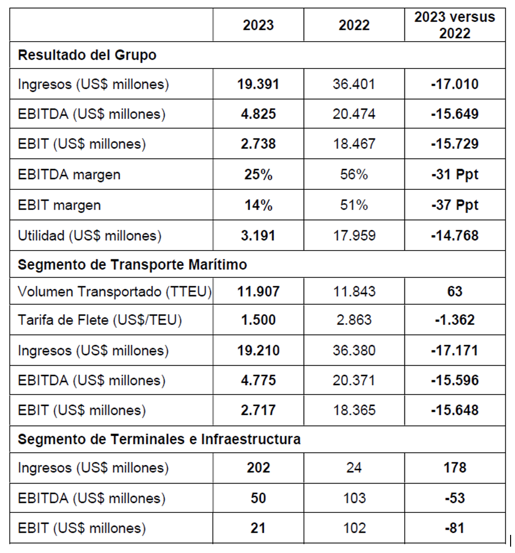 En el segmento de transporte marítimo, los volúmenes de transporte para el 2023 aumentaron un 0,5% hasta 11,9 millones de TEU (2022: 11,8 millones de TEU). Los gastos de transporte disminuyeron un 11% hasta los US$ 12.900 millones (EUR 11.900 millones), principalmente debido a menores gastos por estadía y de almacenamiento de contenedores y un menor precio de combustible. Los ingresos cayeron a US$ 19.200 millones (EUR 17.800 millones), principalmente debido a una menor tarifa de flete promedio de US$/TEU 1.500 (2022: US$/TEU 2.863). El EBITDA para 2023 disminuyó a US$ 4.800 millones (EUR 4.400 millones) y el EBIT cayó a US$ 2.700 millones (EUR 2.500 millones).